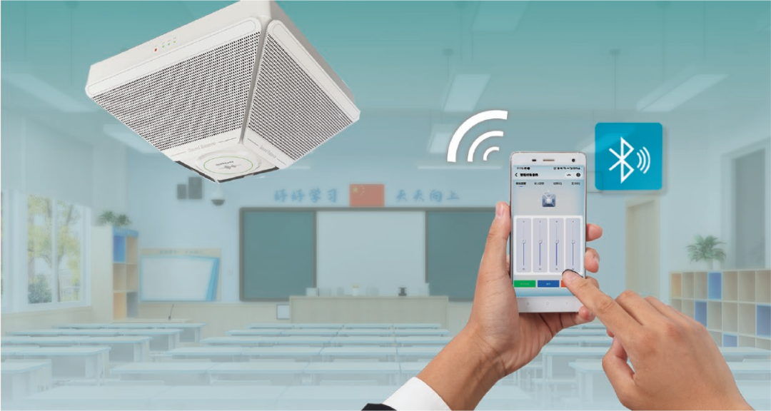 智慧教室均衡擴聲系統從根本上改善教室聲環境,保護聽力健康。系統支持手機APP調整配置。首次使用時,直接在手機APP進行設置、配網、音箱配置等功能,既能自主配置教室聲壓級在一個安全、合理、健康的范圍內,同時也能減少用戶學習成本,簡單易操作。系統支持藍牙音源輸入和線路音源輸入,滿足教學一體機的多媒體擴聲需求,能兼容多種設備,比如老師通過連接藍牙,就能播放手機里的音源資源,豐富課堂互動與交流,提升授課效果。系統還配置了無線話筒對頻使用,操作簡單,即連即用,搭配IP智能均衡音箱實現本地擴聲,老師在“自然聲”狀態下就能實現傳播音質清晰柔和,告別以往“喊嗓子”。系統尊重和關注教師的身體健康,讓廣大教師能安心從教、舒心從教、靜心從教,倡導各位老師們“一師一麥”,注意個人衛生防護。
