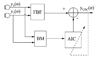 并與麥克風1的信號相減之后,再進行一個低通濾波的結果。顯然,差分麥克風陣列體現的是一種“延遲相減”的思路,將不希望拾取的信號通過相減的方式抵消掉。GSC方法由兩條支路組成,如圖7所示,上面的支路固定波束形成器(Fixed Beamformer,FBF)支路,一般由DSB算法實現,用以增強目標方向信號,抑制其他方向的干擾;下面一條支路由阻塞矩陣(Blocking Matrix,BM)和自適應干擾抵消器(Adaptive Interference Canceler,AIC)兩部分組成,阻塞矩陣用以獲得目標信號零陷位置的參考噪音信號,該信號與DSB輸出中的噪音信號相關,自適應干擾抵消器利用該參考噪音信號估計DSB輸出中的噪音信號,并從DSB輸出信號中減去該估計信號,得到波束形成輸出信號。