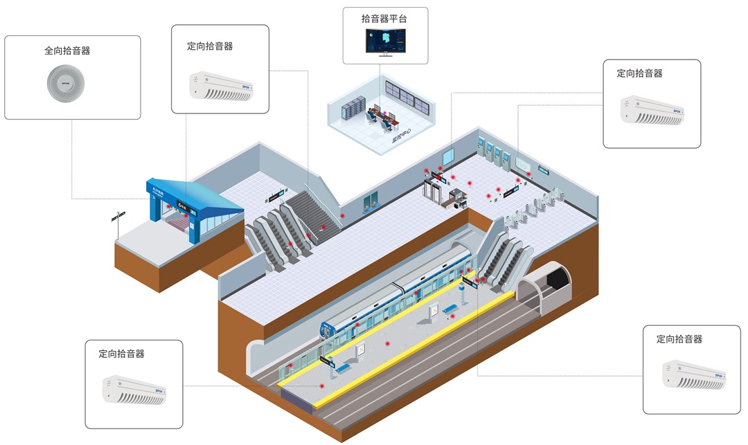 世邦軌道交通音頻監控系統覆蓋站點出入口、服務中心、安檢口、主要通道、等候區等重要場景的音頻監控,具備網絡化管理、實時監聽、音頻回放等功能,與視頻監控互聯互控、共享共用,形成基本覆蓋軌道交通站點治安防范區域的全天候音視頻監控網絡。